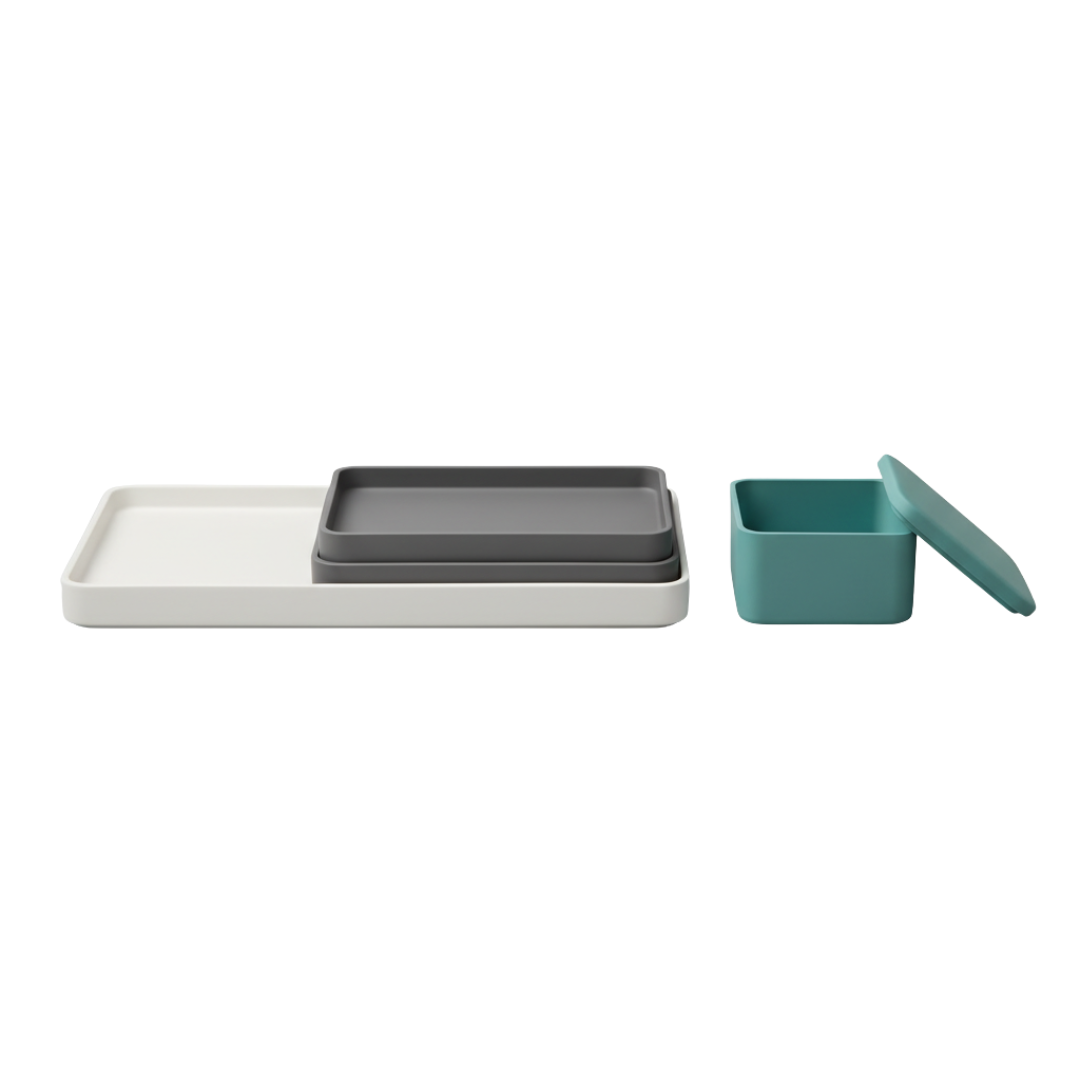• Bestandteile: 1x große Basisablage, 1x mittelgroße stapelbare Ablage, 1x kleiner Behälter mit Deckel