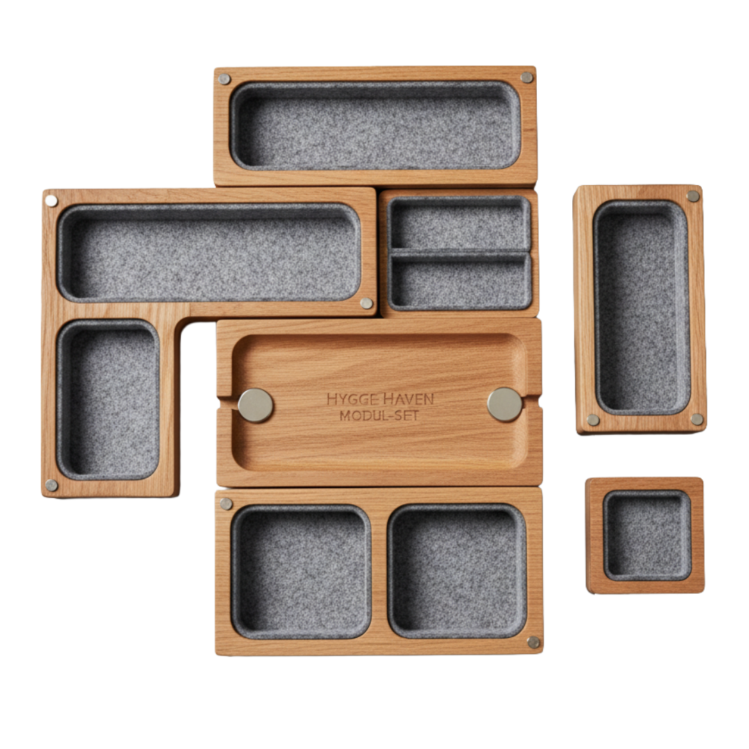 Verwandeln Sie Ihren Arbeitsbereich mit dem Hygge Haven Modul-Set in eine Oase der Ruhe und Ordnung. Dieses exquisite Organizer-Set wurde für den modernen Menschen entwickelt, der Wert auf Funktionalität, Ästhetik und Nachhaltigkeit legt. Es bietet eine elegante Lösung, um Ihren Schreibtisch übersichtlich zu halten und gleichzeitig einen Beitrag zum Umweltschutz zu leisten. Ideal für Heimbüros, kreative Studios oder jeden Ort, der eine Prise skandinavischer Gemütlichkeit vertragen kann.